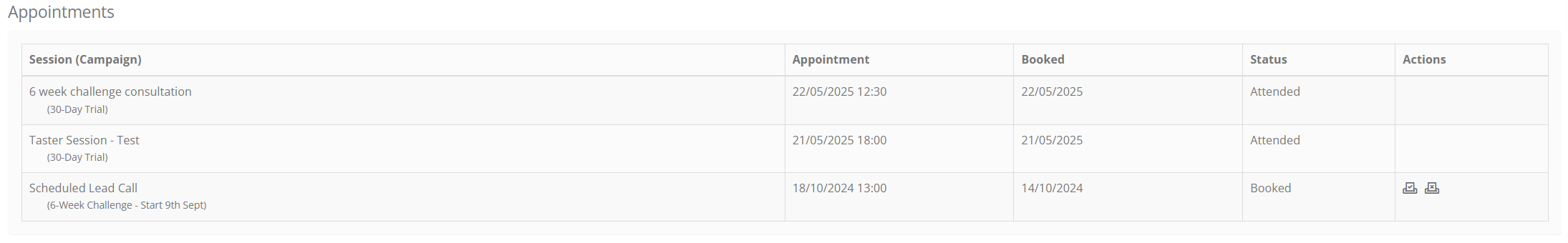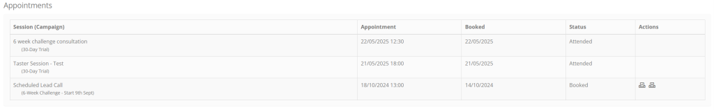 Within the Appointments section, you can see the marketing sessions that the lead has booked via a campaign, or that they have been added manually. These are not DropSlot consultations; they are found on the Consultations tab.