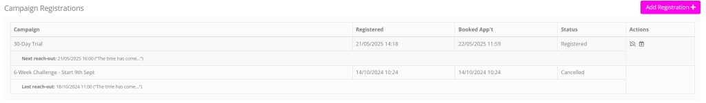 When a lead registers against a campaign, or a campaign is assigned to the lead manually, the campaign appears in the campaign registrations listing.