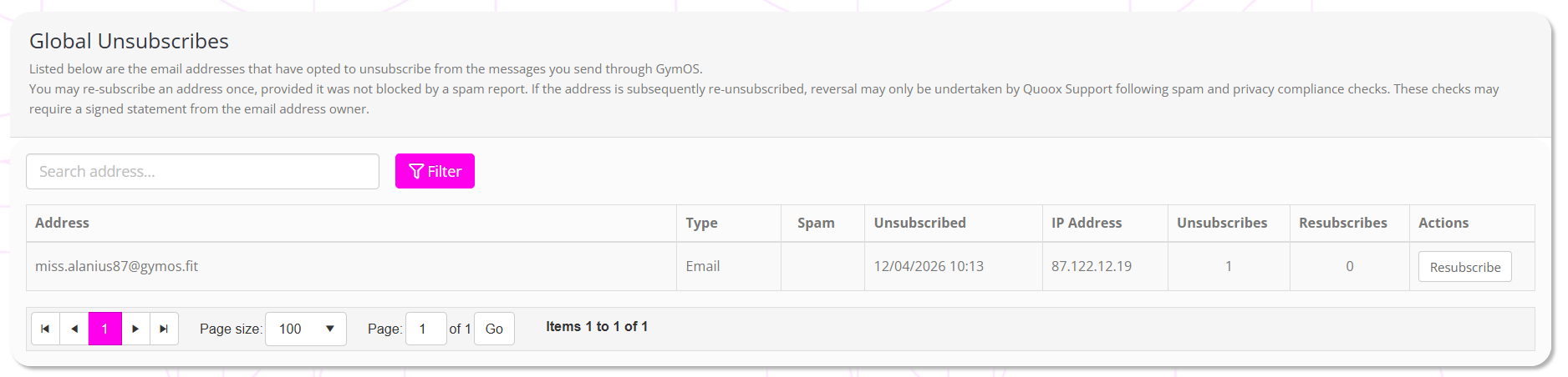 - Unsubscribes arising from a spam report may only be actioned by the GymOS support team, and require that the individual complete the resubscribe request form, attached to this article.