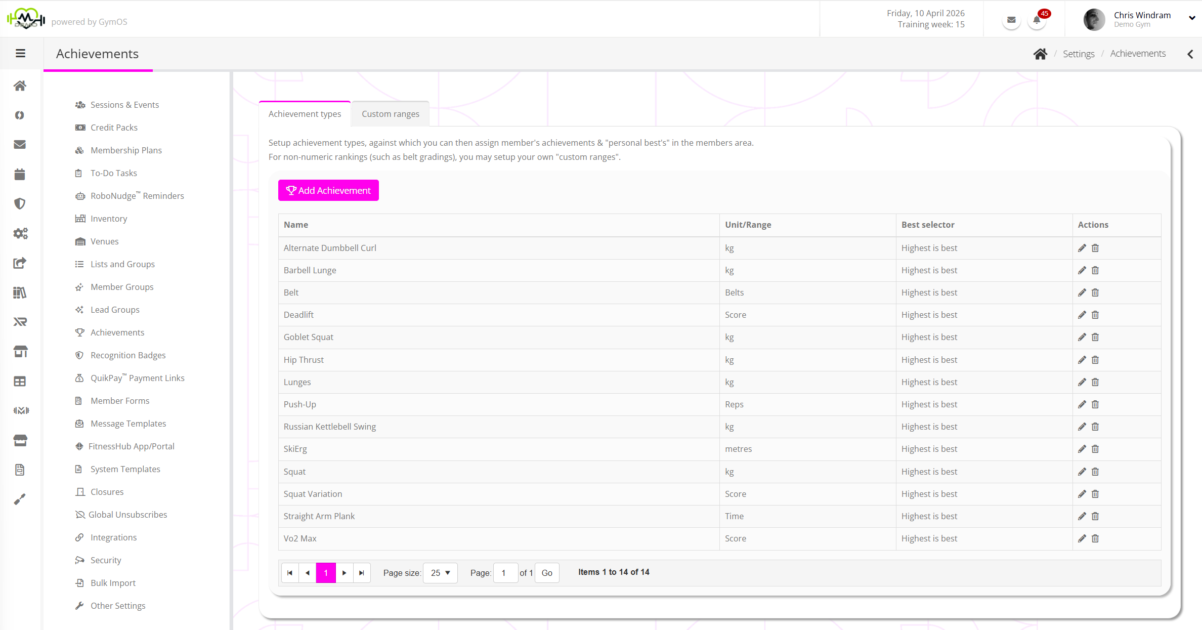 Within GymOS, you can record achievements against each of your members. In turn, the system will calculate their personal best for each category.
