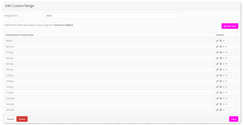 Achievement Ranges provide a method for ranking non-numeric achievements, such as belts; medals etc.
