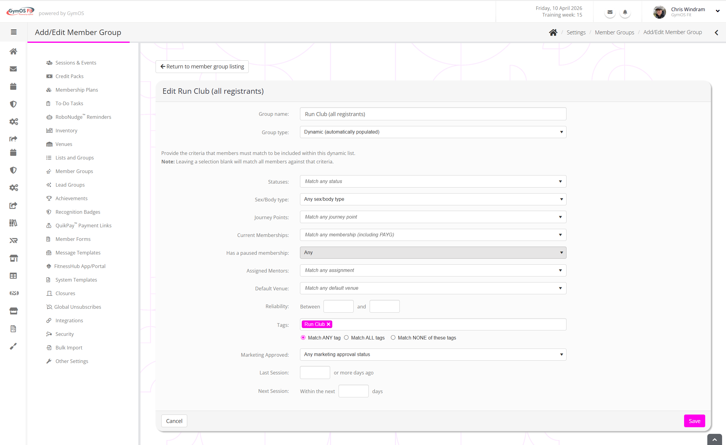 You specify criteria for the group, and GymOS automatically maintains the group to include only members that meet those criteria.