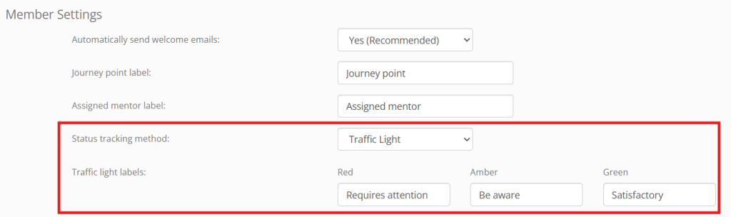 By default, the member status is configured as a traffic-light system with the options: Requires Attention, Be aware, and Satisfactory. The default setting is Satisfactory.