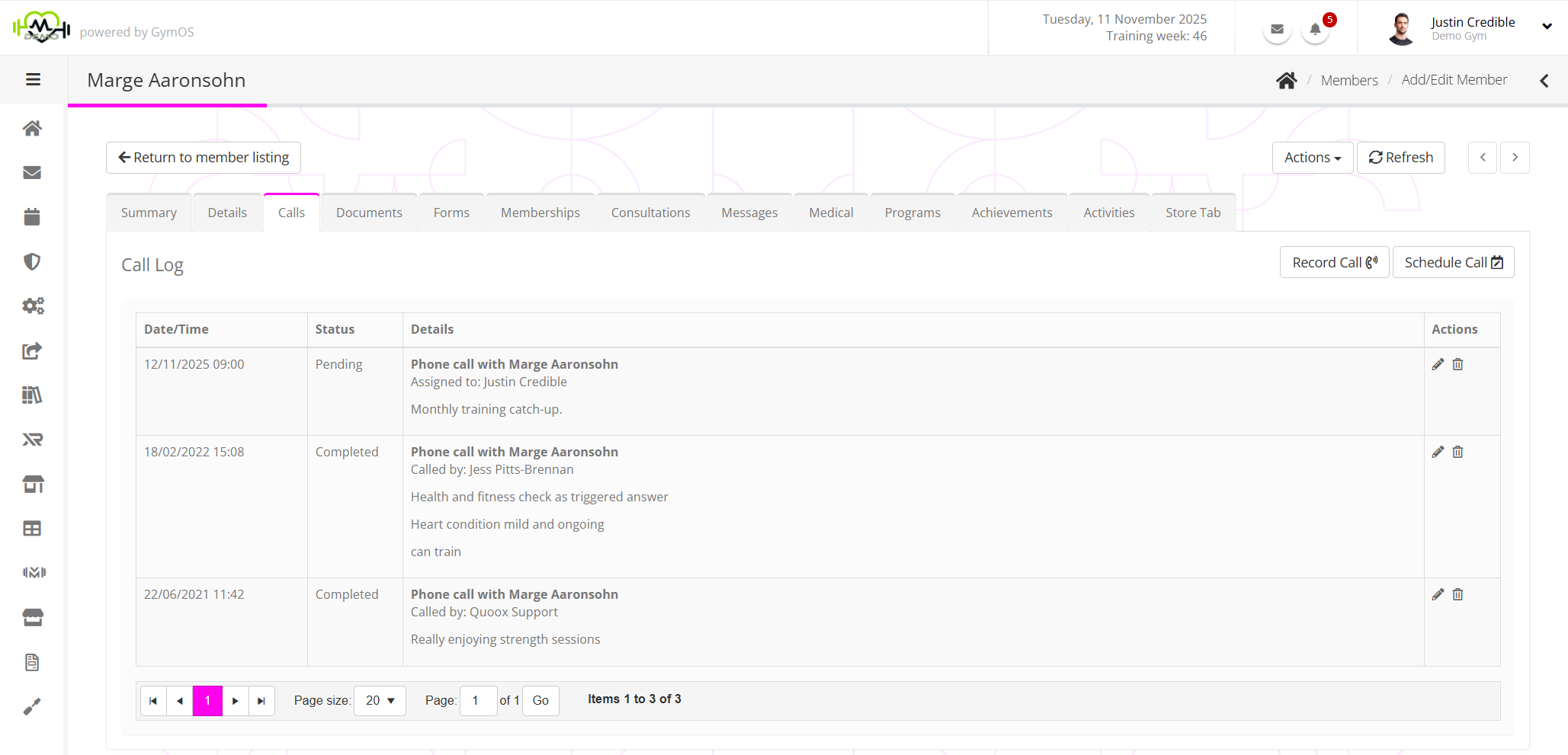 The Calls tab is the Call Log for the selected member. On this page, you can schedule future calls with a member or record the details and outcome of completed calls.