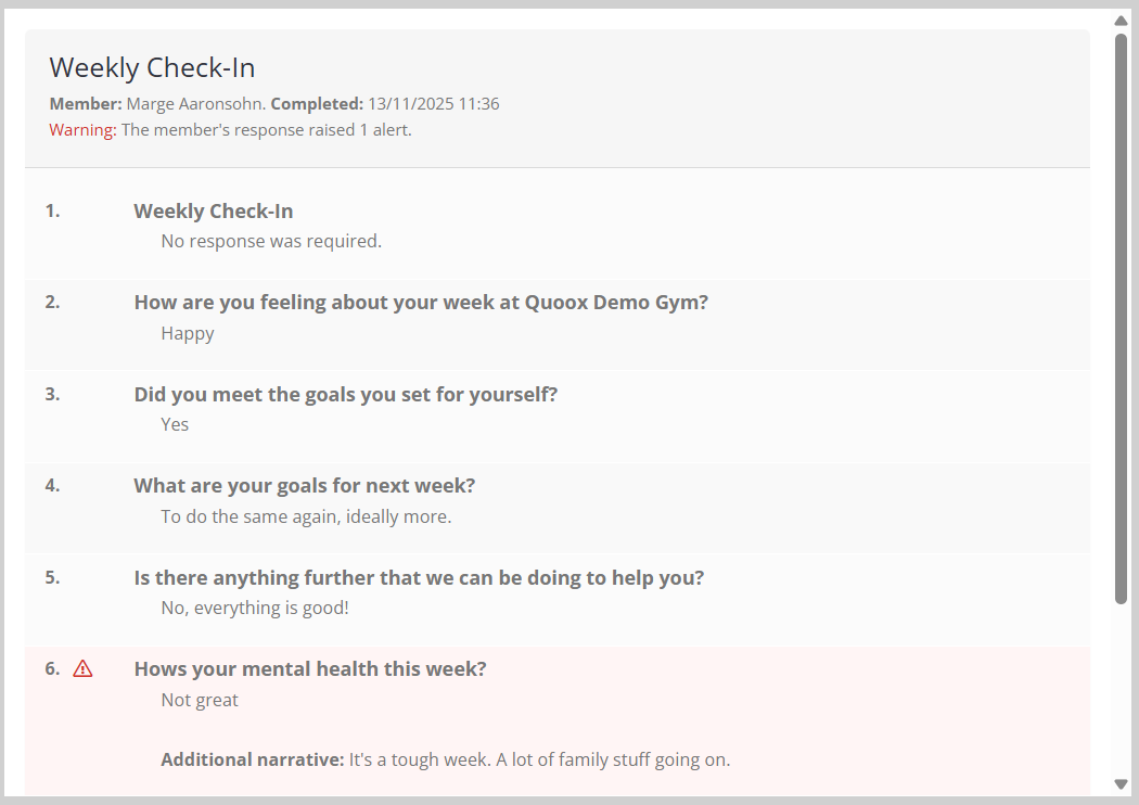 If any of the responses provided by the member flag an alert, that response will be highlighted and an symbol displayed alongside.