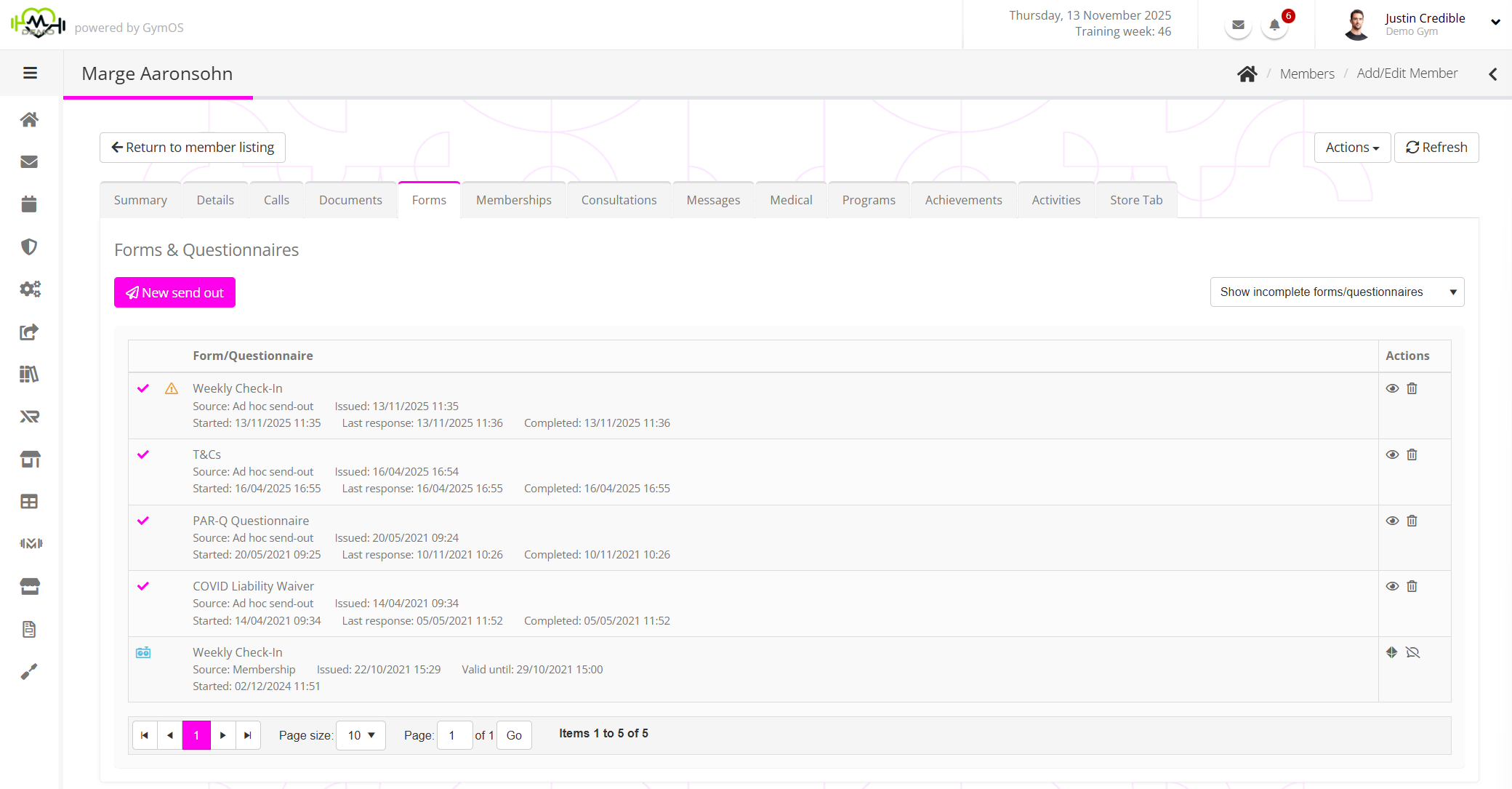 There are many ways within the GymOS system to send a form or questionnaire to a member for completion. One of those methods is the New send out button on the Forms tab of the member record.