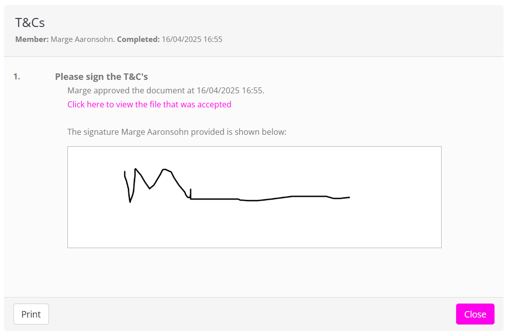 If the form had an associated document with it (E.g., a membership contract), a link will be provided to the precise file that the member was shown and that they gave their acceptance to.