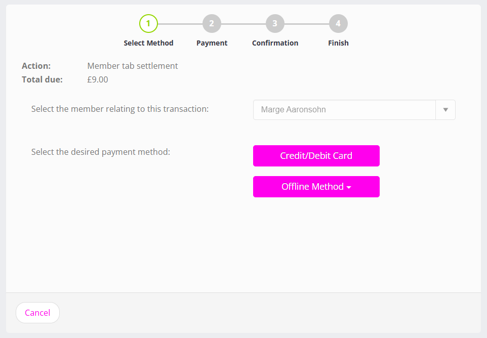 The charge and the member will already be pre-filled. Simply select the payment method, and complete the process.