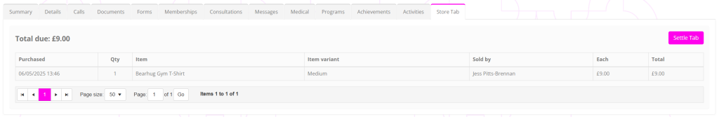 The Store tab on the member record is where you can record any store items the member has purchased or consumed but not yet paid for. For example, if you charge £1 for a bottle of water, it doesn’t quite fit with a premium product that requires members to pay £1 each time. You may, instead, offer the member a “tab” upon which you accumulate their expenditure and then charge for it periodically (E.g. once per week).
