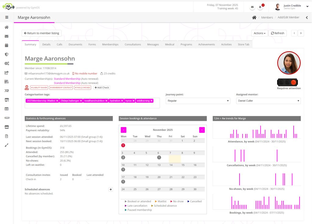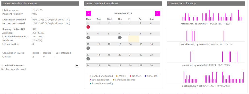 Other statistics include their reliability in booking and attendance. It is also possible to easily view their last booked session, as well as their next booked session.