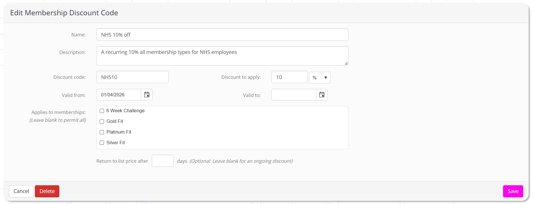 Clicking Save will save the discount code. Clicking Cancel aborts any changes, and clicking Delete will delete the discount code.