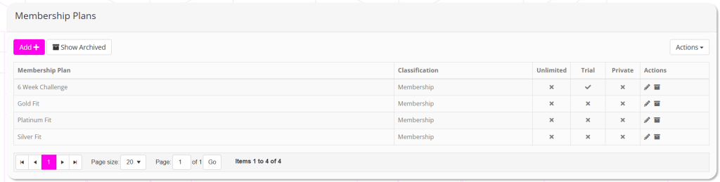 The discount code functionality is accessed by selecting the Discount codes option from the Actions button found on the Membership Plans listing, in Settings.