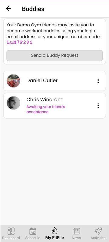 From the My FitFile screen, the member can tap on Buddies to open the Buddies page. Here, they will see: