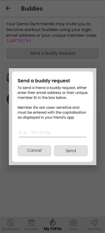 To add someone as a Buddy, the member can tap the Send a Buddy Request button. They will then be asked to enter either: