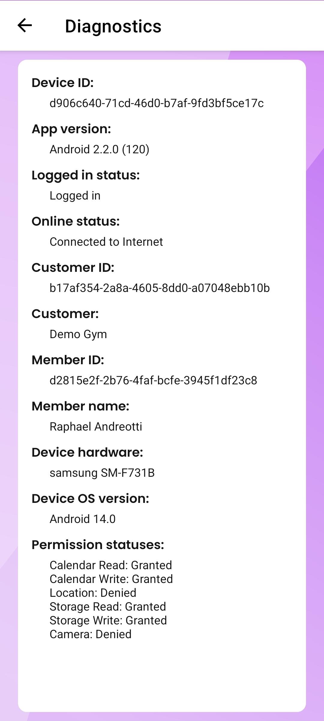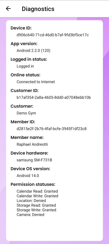 In rare cases, the support team may ask a member to provide a screenshot from the App Diagnostics screen. This information helps the team investigate and resolve app-related issues more effectively.