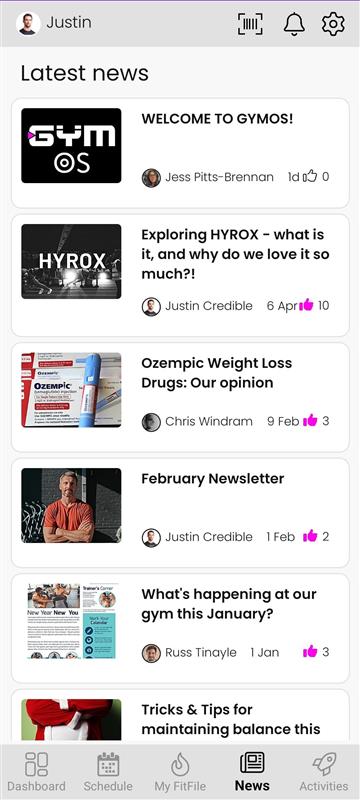 When the member taps the News icon , they are taken to a page displaying all news articles published by the gym. Articles are presented in a list format, allowing the member to scroll through and view any updates that interest them.