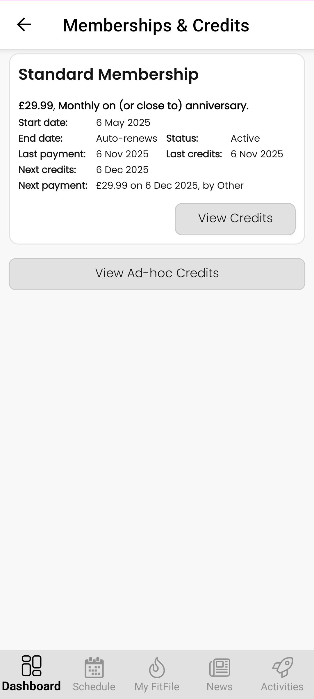 If the gym has issued the member any ad-hoc credits, these will appear on the same screen. The member can tap Ad-hoc Credits to view details such as: