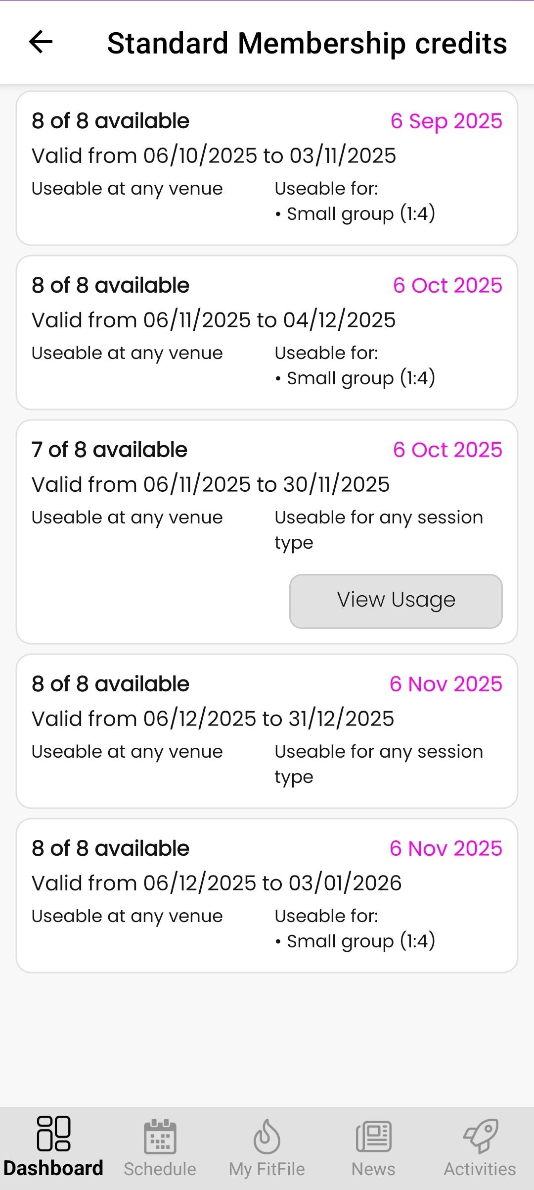 If the member has used credits from a particular credit pack, a View Usage button will be displayed on that pack. When tapped, this opens a detailed usage history showing: