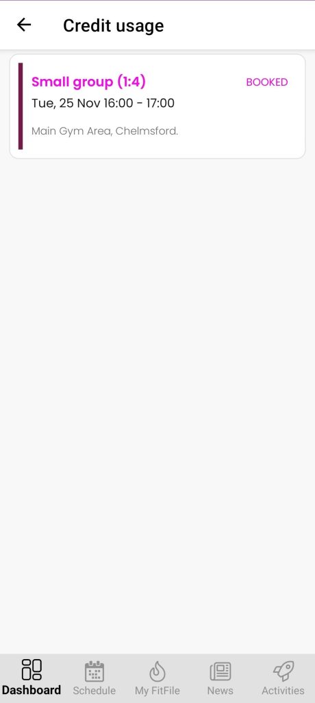 From the Dashboard, the member can tap on Available credits. This opens a screen showing their active membership, along with key details such as: