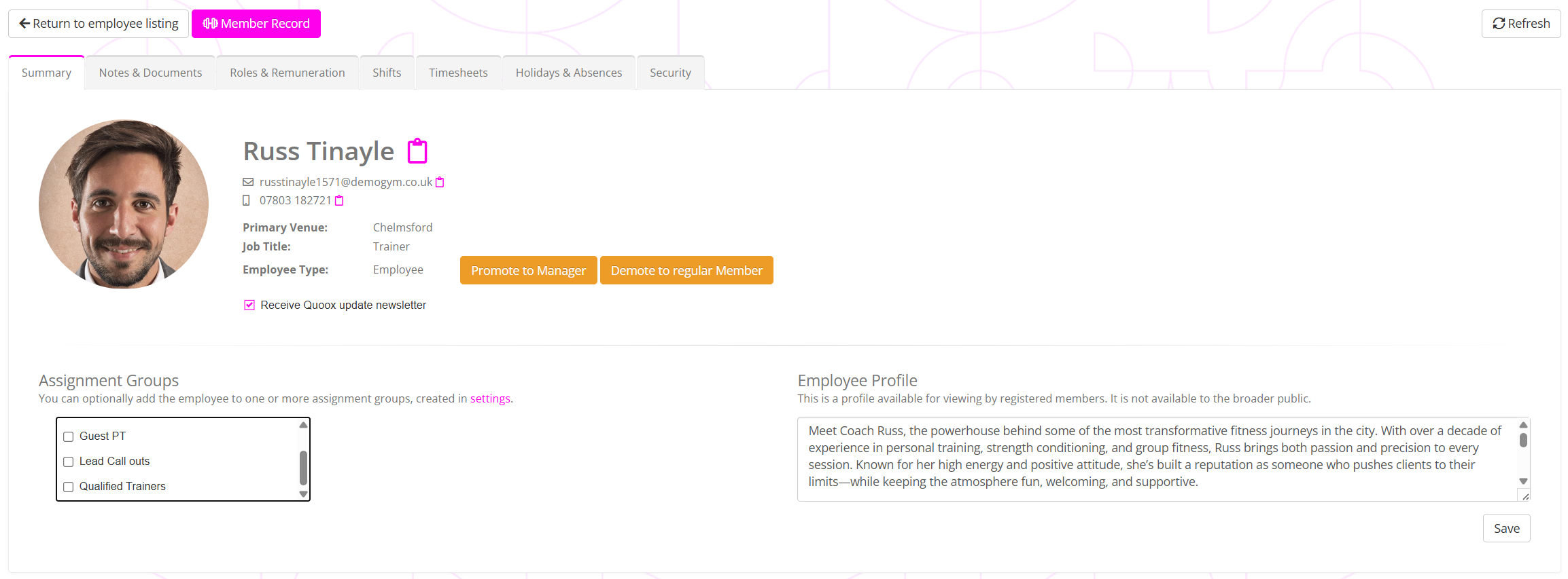 The employee record is where information regarding a given staff member is stored and accessible. It provides access to the employee’s configuration and carries through to functions throughout the GymOS system.