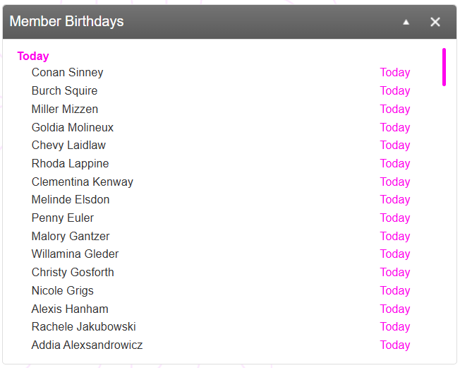 Acknowledging and celebrating birthdays is a critical aspect of building rapport and community with your members. The Member Birthday widget provides you an at-a-glance view of those members who have a birthday coming up in the next 3-days.