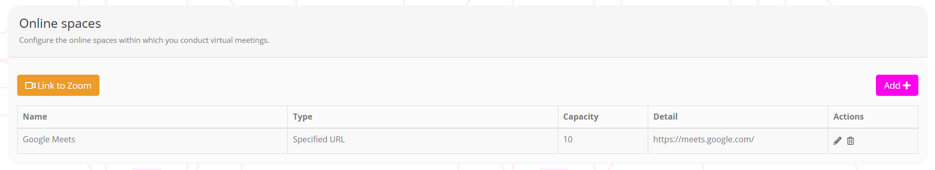 To add a new online space, click the Add button. You may also edit an existing space, by clicking the icon. Clicking deletes the online venue space.